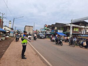 BANYUASIN - Personil Polsek Pangkalan Balai Polres Banyuasin melaksanakan pengaturan arus lalulintas di sekitar Pasar Pasar Beduk dan Pasar...