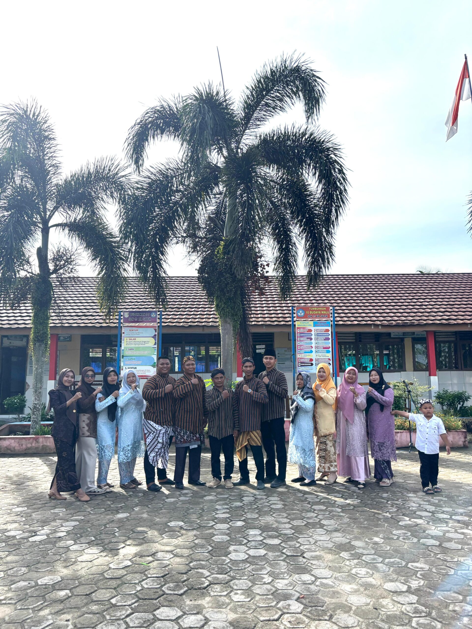 Dalam upacara tersebut Eka Ardelina, S.Pd, bertindak sebagai pembina upacara. Sedangkan para ibu guru SDN 15 Air Salek dengan berkebaya dan Bapak guru berpakaian khas daerah Jawa “Surjan Lurik” menjadi petugas upacara.