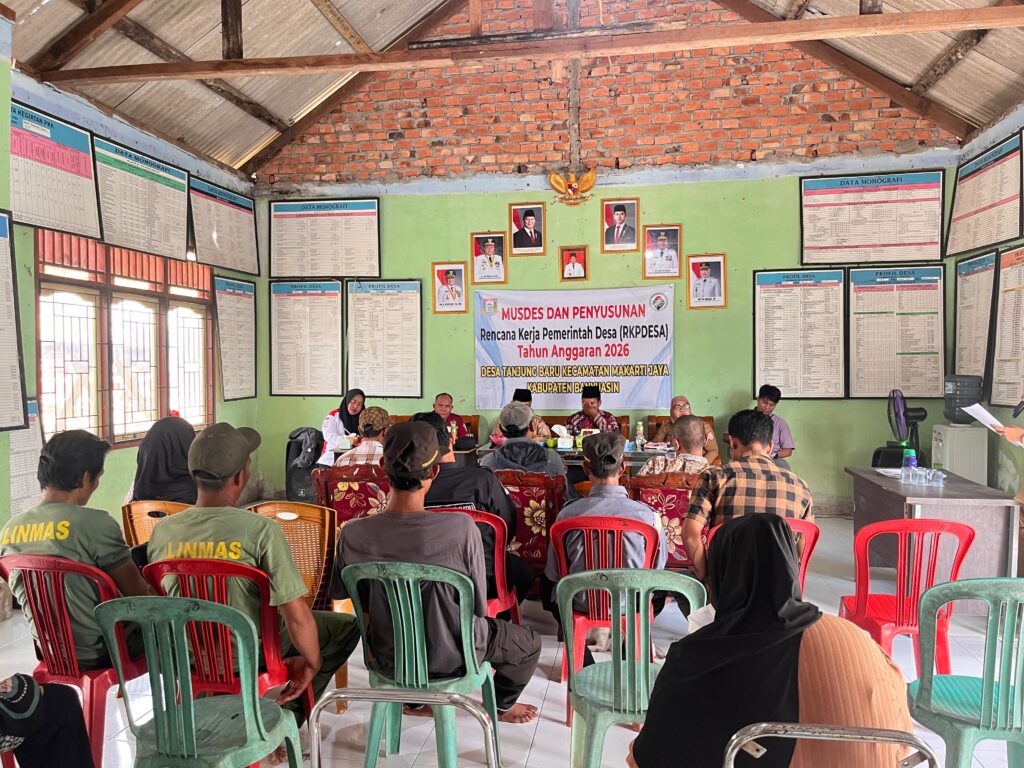 BANYUASIN, Lensainnews.com – Bertempat di Kantor Desa Tanjung Baru, kecamatan Makarti jaya, kabupaten Banyuasin. telah dilaksanakan Musyawarah Desa (Musdes) dalam rangka Penyusunan Perencanaan Pembangunan Desa (RKP Desa) Tahun 2026. Peserta yang terlibat dalam kegiatan ini meliputi unsur BPD, Kepala Desa, perangkat desa, TP PKK Desa, Ketua RT, linmas desa, Kader Kesehatan, Karang Taruna, tokoh agama dan tokoh masyarakat. Kegiatan juga turut dihadiri oleh camat Makarti jaya, Bapak Subandi, S, Sos, M Si. Kasi PPD Kecamatan, Pendamping Desa, Pendamping Lokal Desa, serta masyarakat, Jum at, (03/10/2025).